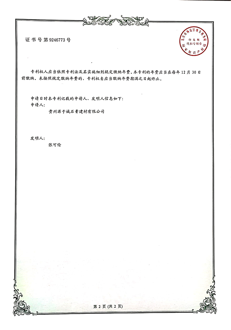專利證書(shū)(一種石膏生產(chǎn)用烘料倉(cāng))